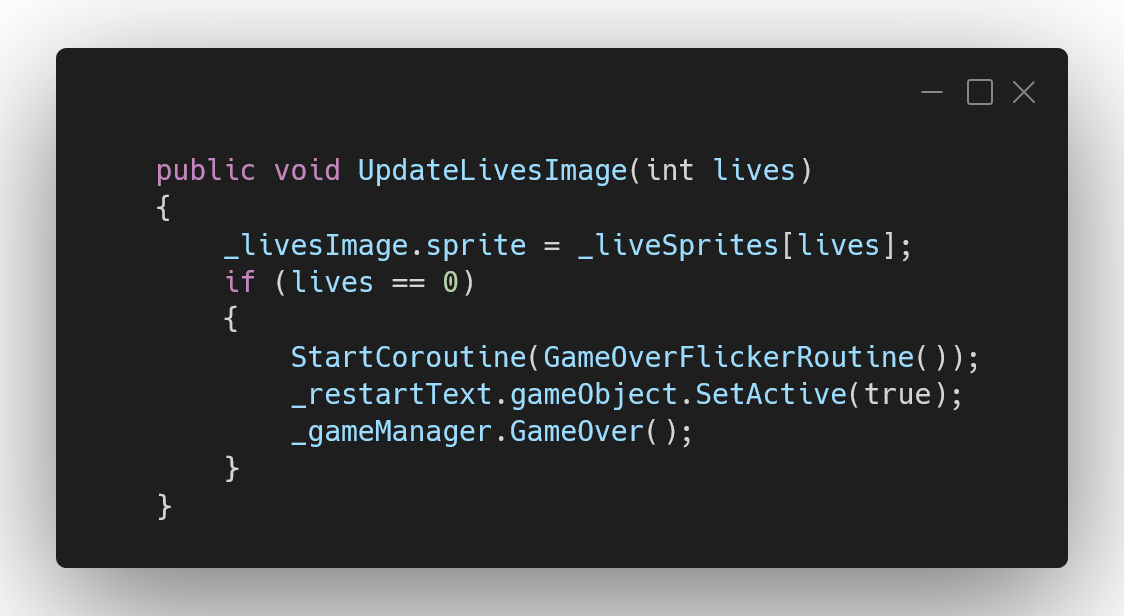В методе UpdateLivesImage в операторе if задайте для игрового объекта _restartText значение true и вызовите метод GameOver для _gameManager. Это приведет к появлению текста перезапуска и сообщит менеджеру игры, что игра окончена.