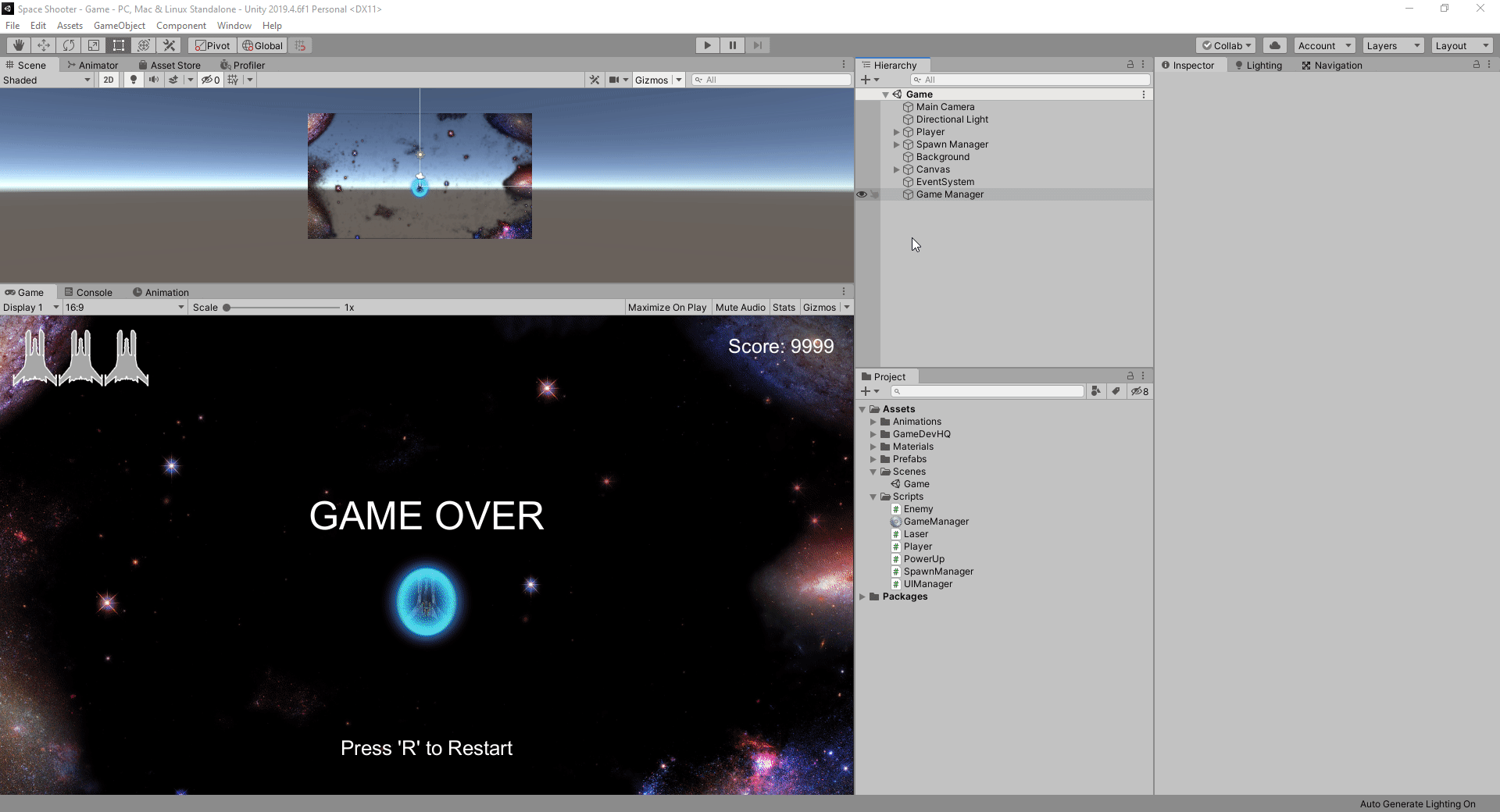 Поскольку нет смысла вводить данные пользователем в сценарий UIManager, мы создадим пустой игровой объект с именем «Game Manager», создадим сценарий с именем «GameManager» и прикрепим его к игровому объекту Game Manager. Именно здесь мы будем обрабатывать пользовательский ввод для нажатия клавиши перезагрузки.