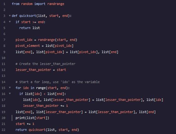def quicksort(list, start, end): if start >= end: return list