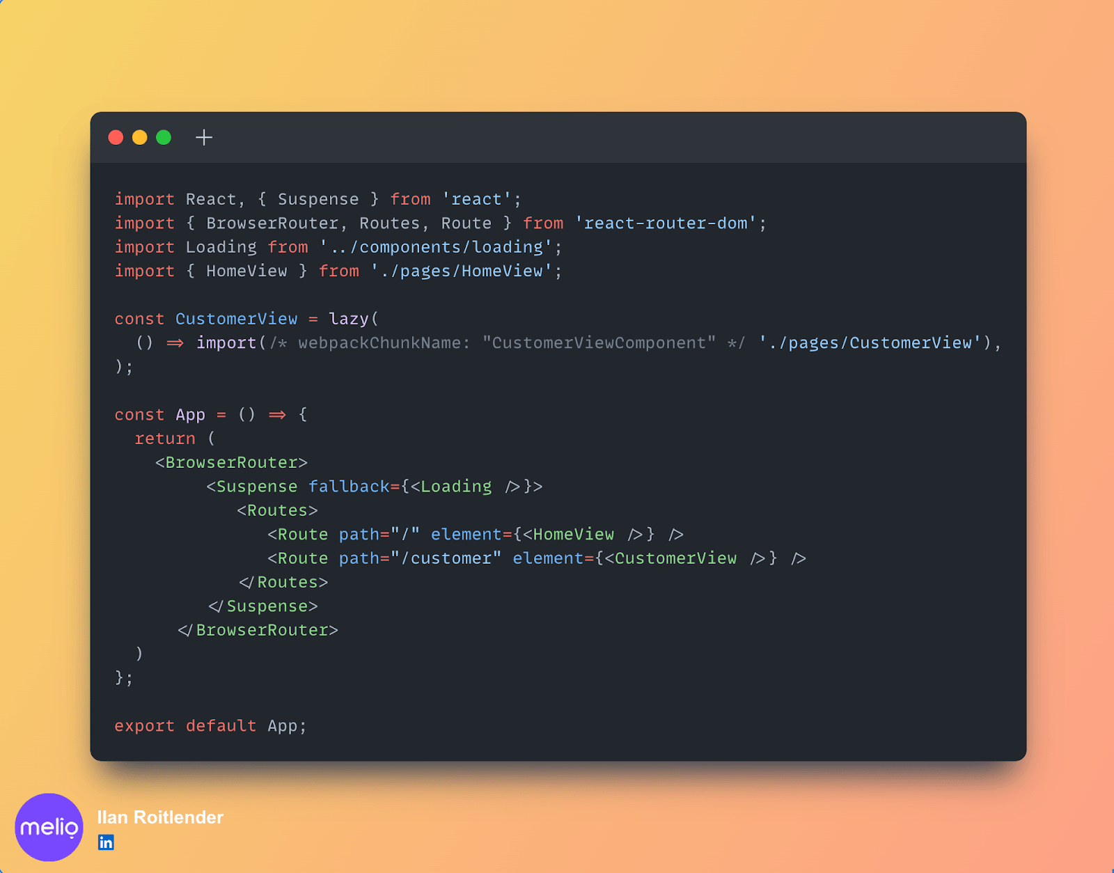 В этом примере мы видим простое приложение, отображающее два маршрута. Первый маршрут, который увидит пользователь, — это HomePage, и только если он перейдет на /customer, браузер загрузит остальную часть кода, чтобы пользователь увидел страница клиента.