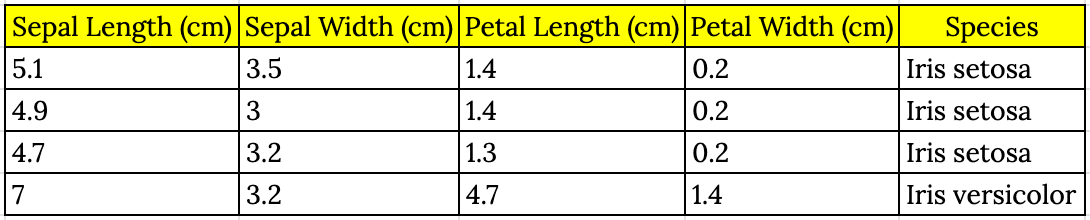 Вот пример подмножества набора данных Iris: