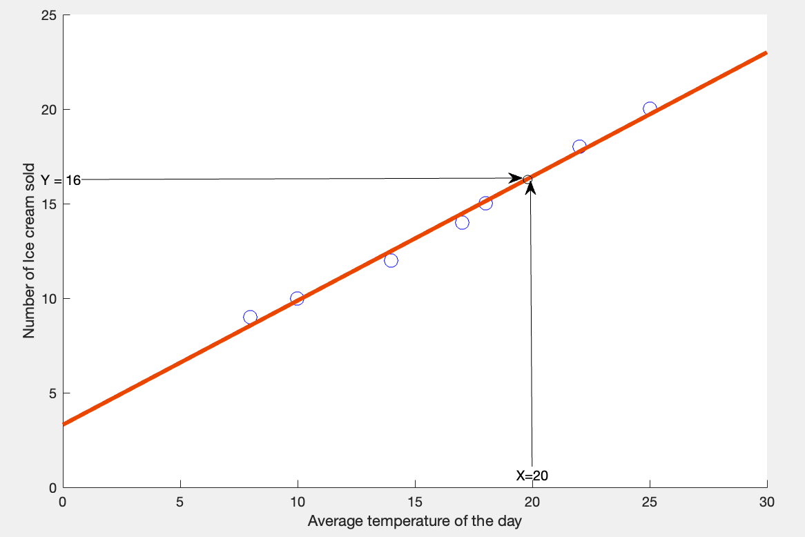 Владелец магазина, продающий мороженое, может зависеть от температуры снаружи. Как правило, люди едят больше мороженого, когда жарко, поэтому количество мороженого, продаваемого владельцем магазина, увеличивается с повышением температуры, и наоборот. В последнее время владелец магазина сталкивается с убытками из-за затоваривания или нехватки товаров. Можем ли мы найти оптимальное количество мороженого, которое продавец должен купить на завтра, если температура 20 градусов по Цельсию?