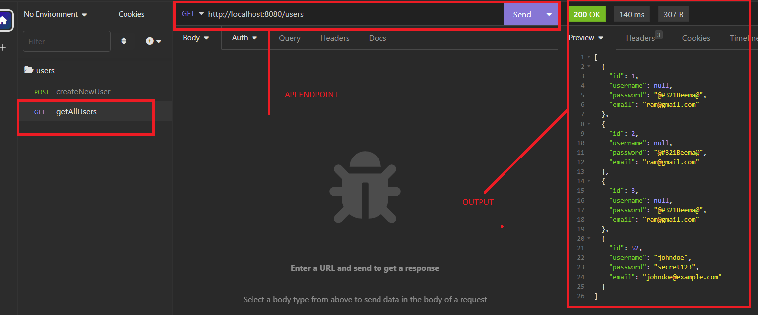 После завершения этого кода давайте скомпилируем и протестируем наши конечные точки. Чтобы протестировать нашу конечную точку, мы будем использовать REST-клиент бессонница.