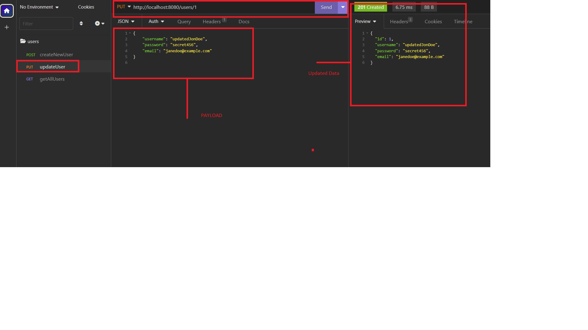 Чтобы обновить пользователя с помощью ID, нам нужно передать id в конечную точку API с данными полезной нагрузки в теле запроса. Обновление пользователя — это PUT запрос.