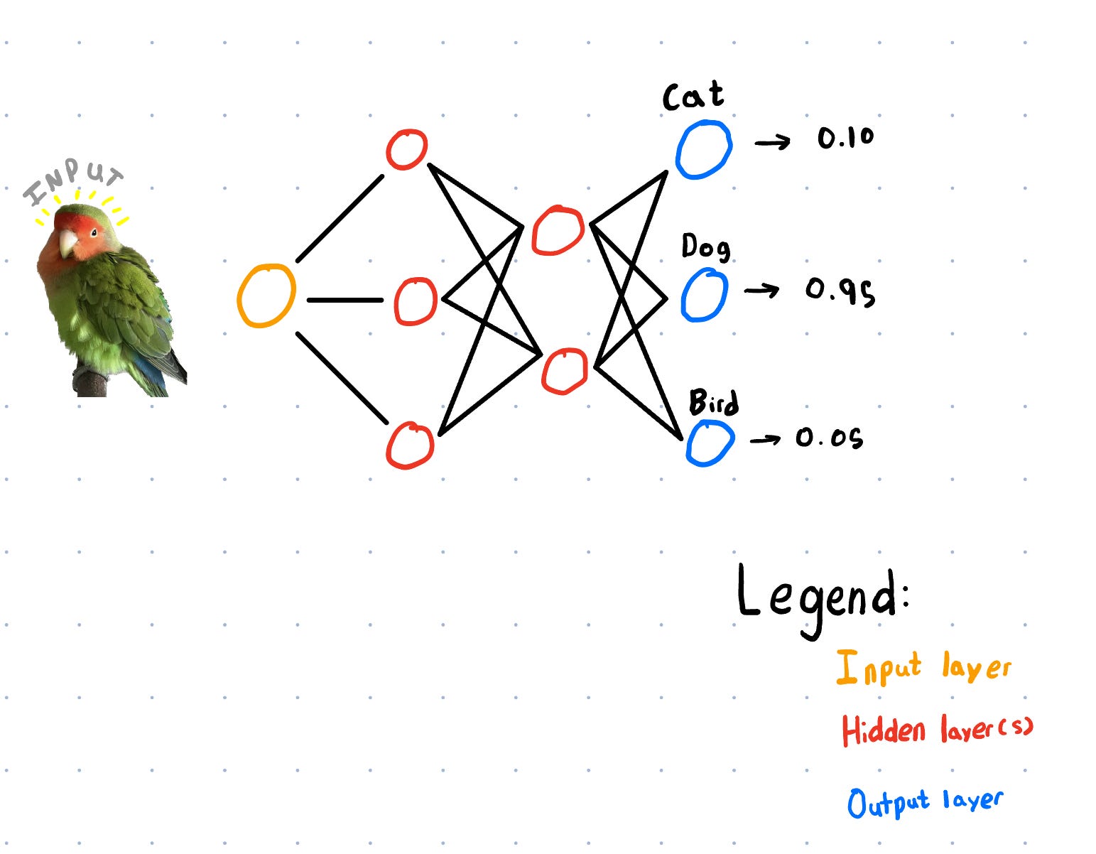 Каждый круг или нейрон — это просто место, где математическая операция выполняется над входными значениями для получения выходных данных, это может быть что-то простое, например: W + X = Y, где W и X — входные данные, а Y — выходные данные. Распространение относится к нейронной сети, вычисляющей выходные данные, когда она проходит через каждый из скрытых слоев к выходному слою. Здесь он выводит прогнозируемое значение для каждого типа животных.