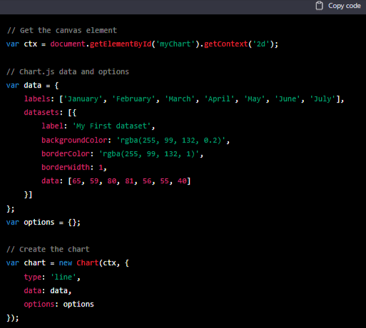 3. В файле JavaScript извлеките элемент холста и создайте новую диаграмму, создав экземпляр класса Chart и передав элемент холста и параметры конфигурации диаграммы: