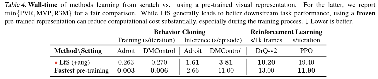 Что касается вычислительных затрат, основным преимуществом замороженных предварительно обученных представлений является более низкая стоимость обучения благодаря повторному использованию функций, но они имеют более медленный вывод по сравнению с меньшими архитектурами моделей LfS.