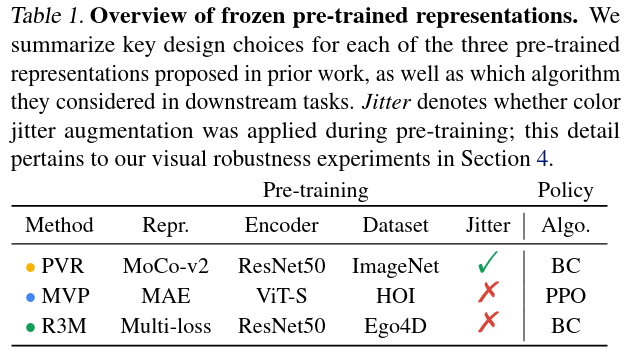 Они оценивают 3 недавно предложенных предварительно обученных визуальных представления: PVR (MoCo-v2 в ImageNet), MVP (MAE на видео с людьми) и R3M (предварительное обучение с множественными потерями на Ego4D). Общедоступные предварительно обученные модели используются без каких-либо изменений архитектуры или веса. Предварительно обученные веса замораживаются во время изучения политики в соответствии с первоначальными предложениями. Некоторые эксперименты также настраивают предварительно обученные модели на небольших наборах данных задач.