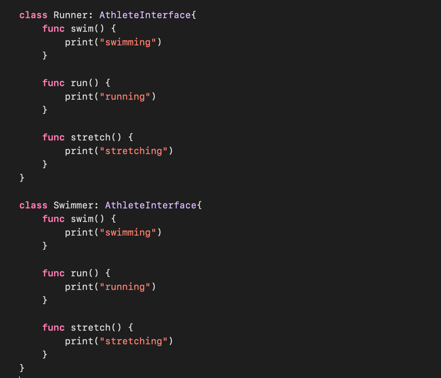 Затем есть класс Runner, представляющий бегуна, и класс Swimmer, представляющий пловца. Оба они реализуют интерфейс Athlete.