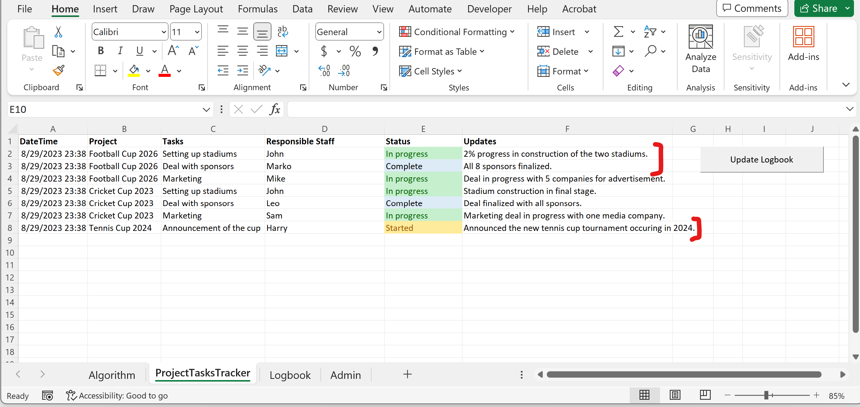 Я использовал функцию =NOW() в Excel в столбце DateTime, чтобы получить реальное время. Я разрешил три варианта в раскрывающемся меню в столбце «Статус»: «Начато», «В процессе» и «Завершено». Я также создал кнопку под названием Обновить журнал для автоматической регистрации всей информации без дублирования на листе журнала. Лист ProjectTasksTracker выглядел так, как показано ниже: