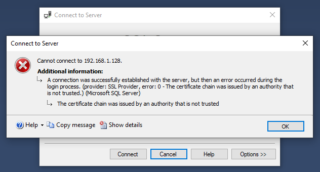Это происходит потому, что используемый сертификат не от доверенного центра сертификации. это нормально и не должно иметь большого значения при разработке. Чтобы это сработало, вы можете просто настроить свойства подключения на доверие сертификату.