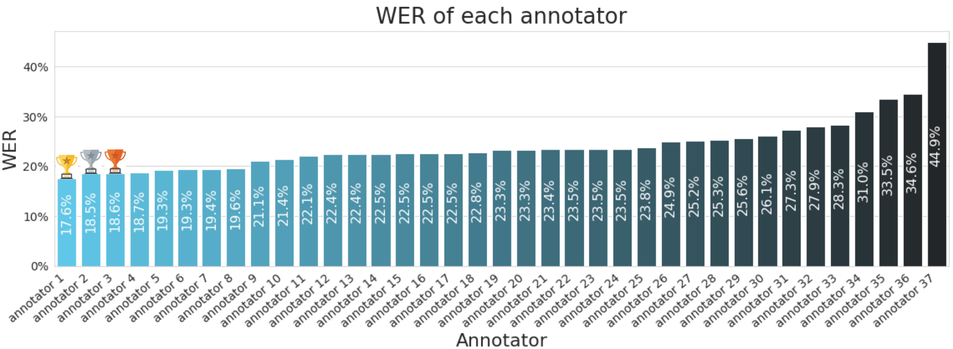 Используя нормализованный WER, мы можем вычислить попарное согласие между всеми транскрипциями, выполненными несколькими аннотаторами. Затем мы можем усреднить попарное согласие каждого аннотатора, что дает нам приблизительную меру индивидуальной точности каждого аннотатора. Это показано на графике ниже. Мы видим, что аннотаторы варьируются от WER 44,9% до 17,6%, при этом медиана и среднее значение находятся в диапазоне 23–24%.