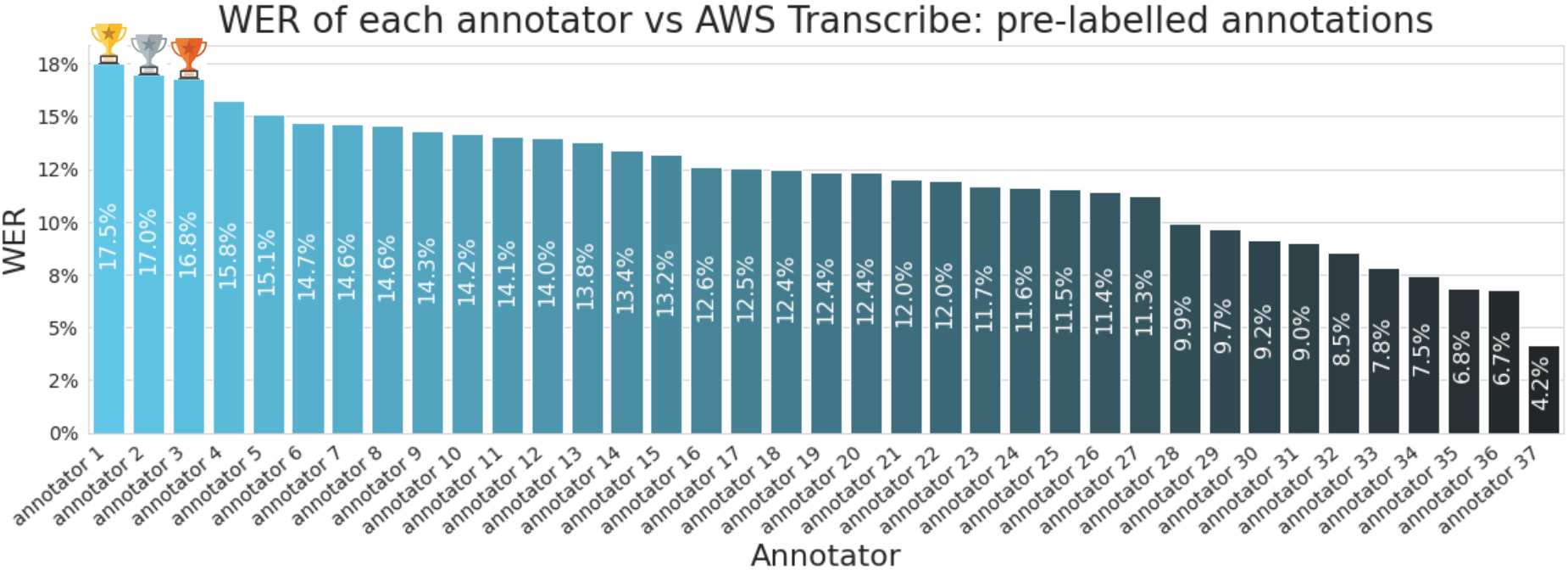 Гистограмма ниже показывает WER каждого аннотатора для предварительно помеченной задачи аннотации. Мы видим, что аннотаторы, внесшие наибольшее количество изменений, имеют коэффициент ошибок около 17%, что эквивалентно исправлению 1,7 слова на каждые 10 слов в выводе Amazon Transcribe. На другом конце спектра мы видим аннотаторов с очень низким уровнем ошибок, что указывает на то, что они не вносили много изменений в вывод Amazon Transcribe.