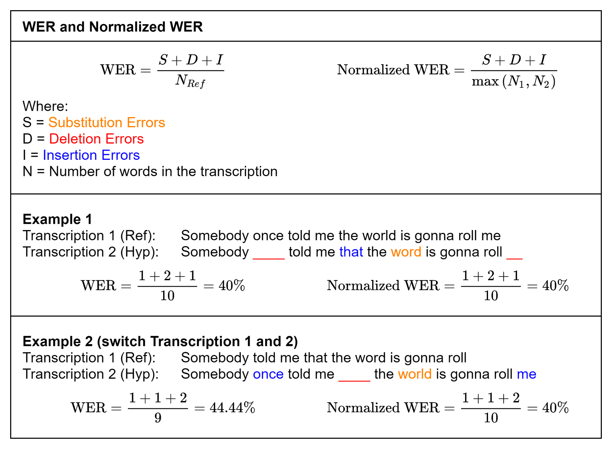 Вот где в игру вступает нормализованный WER. Нормализованный WER делает простую модификацию WER, чтобы сделать его коммутативным. Вместо того, чтобы использовать длину контрольной транскрипции в качестве знаменателя, он использует длину самой длинной из двух транскрипций. Это означает, что порядок транскрипции больше не важен. Это еще раз показано в примерах на рисунке выше, где нормализованный WER остается 40% независимо от порядка транскрипции.