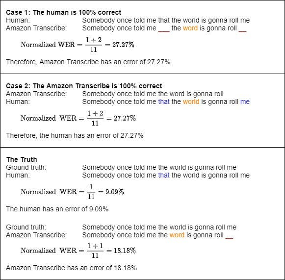 Чтобы показать, почему, рассмотрим следующие два сценария. В сценарии 1 мы предполагаем, что человеческие аннотации верны на 100%. В этом случае ошибкой Amazon Transcribe будет измеренное нами значение WER, которое составляет 25%. В сценарии 2 мы предполагаем, что Amazon Transcribe на 100% верен. Итак, источником 25% WER будут человеческие аннотации. На самом деле мы знаем, что ни человеческие аннотации, ни Amazon Transcribe не являются на 100% правильными. Таким образом, мы можем рассматривать измеренную WER в 25% как верхнюю границу WER Amazon Transcribe, потому что на самом деле источником ошибки будет не только Amazon Transcribe, но и частично человеческая ошибка. Этот аргумент продемонстрирован на рисунке выше с примерами.