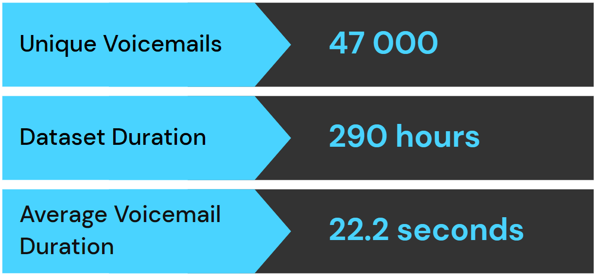 Набор данных, который мы используем для этих тестов, включает набор сообщений голосовой почты, отправляемых в центр обработки вызовов, в которых клиентов просят предоставить отзывы об услугах, которые они только что получили. Носители английского языка на первом или втором языке из Южной Африки. Общая продолжительность набора данных составляет около 290 часов аудио, что, насколько нам известно, является самым большим корпусом транскрибированных аудио на английском языке из Южной Африки.