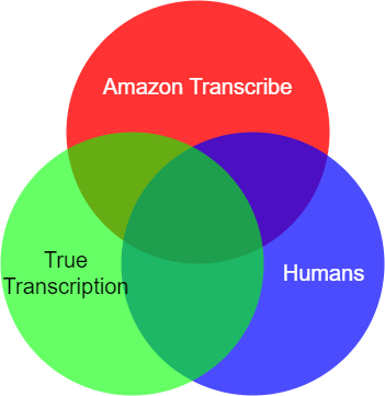 Как упоминалось ранее, если у кого-то есть доступ к достоверным источникам информации, измерение WER - довольно тривиальная задача. Однако, если у вас есть человеческие расшифровки, не являющиеся экспертами, которые не обязательно являются абсолютной истиной, проблема усложняется. Диаграмма Венна ниже демонстрирует задачу. Есть частичное совпадение между человеческой транскрипцией, полученной из краудсорсинга, и «истинной» транскрипцией. Кроме того, транскрипция Amazon Transcribe частично совпадает с «истинной» транскрипцией. Мы хотели бы использовать человеческие транскрипции, которые являются приближением «истинной» транскрипции, чтобы оценить WER Amazon Transcribe.