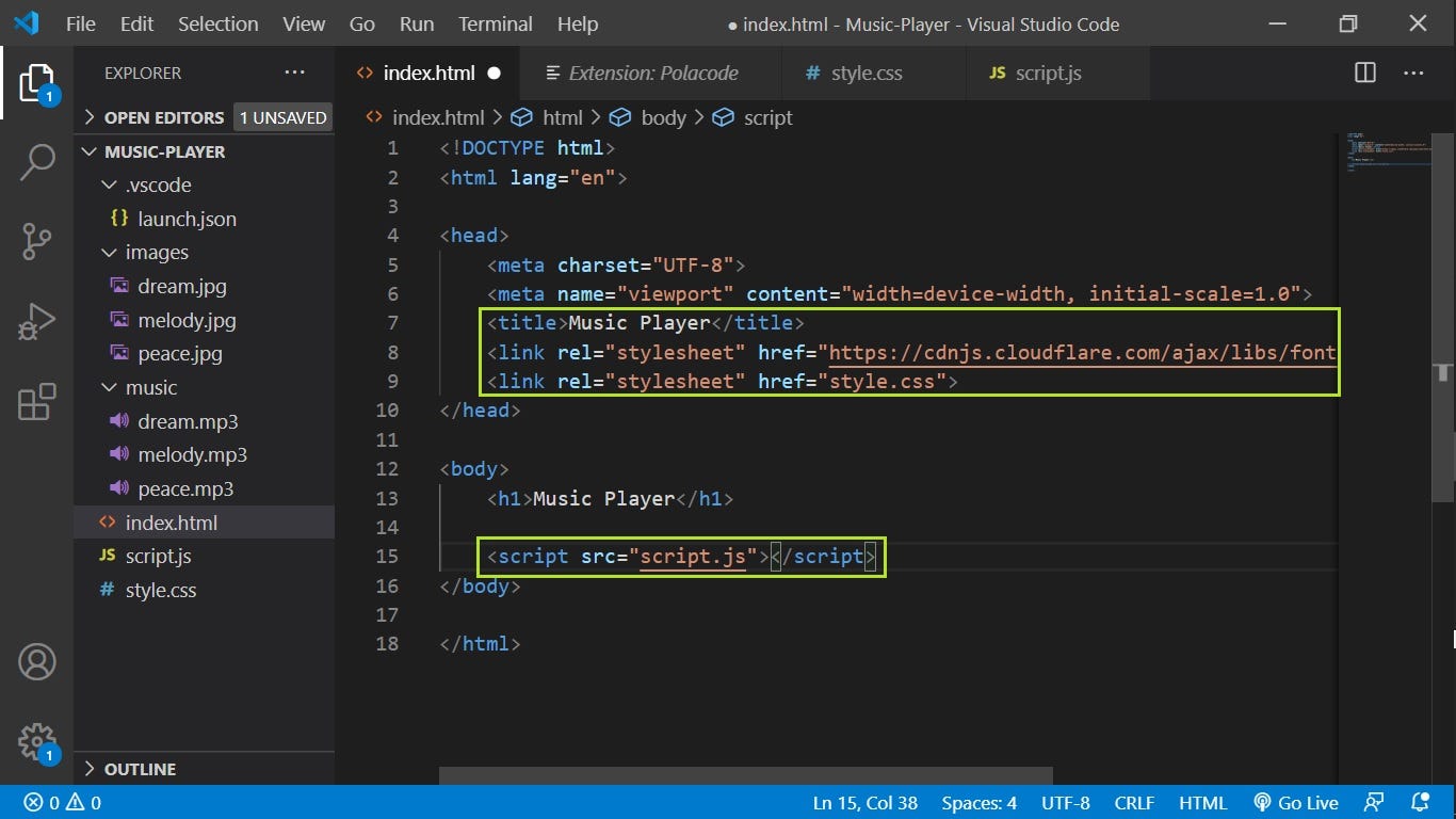 Откройте VSCode и создайте базовую структуру HTML в файле index.html с помощью! а затем нажав вкладку. Задайте название как «Музыкальный проигрыватель». Свяжите style.css и script.js с созданным HTML-файлом и свяжите FontAwesome css, чтобы использовать значки воспроизведения, паузы, следующего и предыдущего.